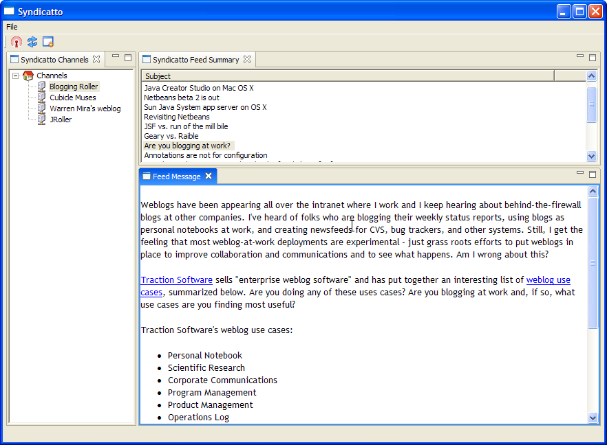 - is a Desktop (Eclipse RCP based) RSS Aggregator. It's in very early stages of development and should be able to release soon.